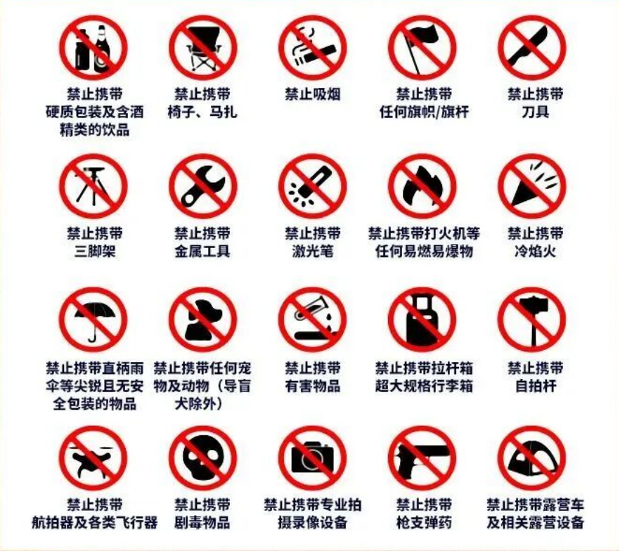 20. 禁携带物品以现场安检要求为准,请协助和配合安检人员的要求。违规者则可能涉嫌违反《大型群众性活动安全管理条例》。对违反规定的团体和个人,现场安保和相关工作人员有权制止或责令退场。