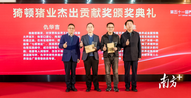 2024年第二届猗顿猪业杰出贡献奖获得者:中国农业科学院哈尔滨兽医研究所研究员仇华吉(左二)、广东壹号食品股份有限公司董事长陈生(右二))