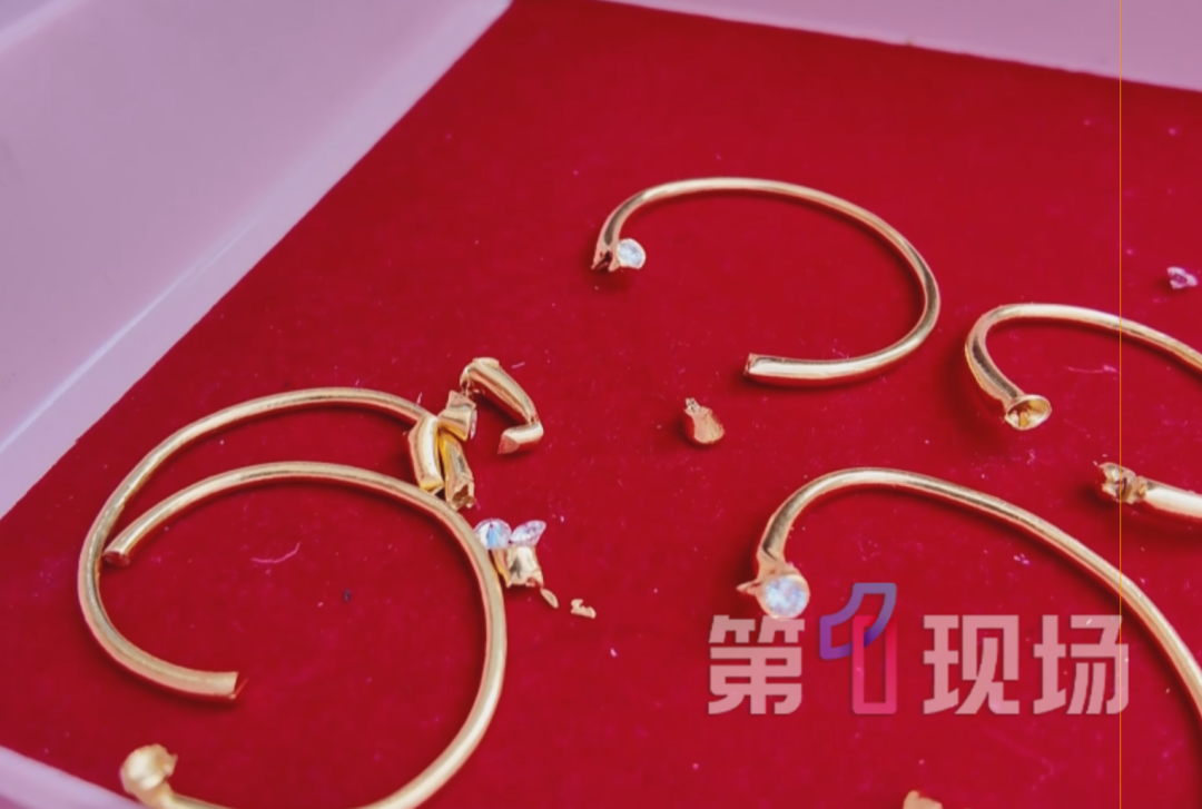 顾客自己佩戴的时候可能没戴好,勾到东西了。黄金本身质地比较软,所以出现了断裂。断裂之后,她就寄到水贝这边来回收。