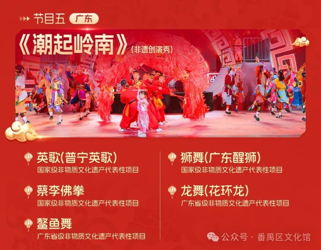 晚会汇集了来自全国31个省的百余位非遗传承人和千余名表演者。其中来自番禺的非遗项目——狮舞(广东醒狮)、沙涌鳌鱼舞在晚会上集《潮起岭南》节目精彩亮相,展现岭南文化的多元魅力。