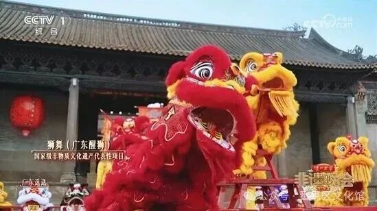 节目画面:狮舞(广东醒狮)在留耕堂前表演