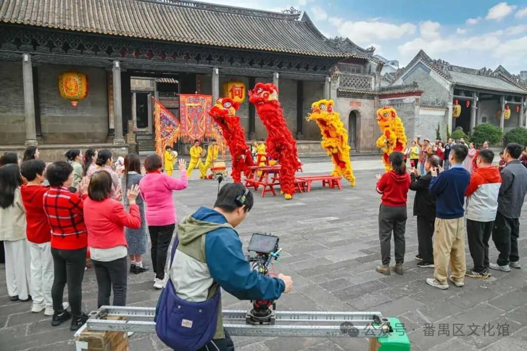 在这里,番禺区沙湾龙狮协会带来了国家级非遗代表性项目狮舞(广东醒狮)的精彩表演。铿锵的锣鼓、矫健的狮影与庄严的古建筑交相辉映,展现出非遗在真实历史场景中传承发展的鲜活生命力。